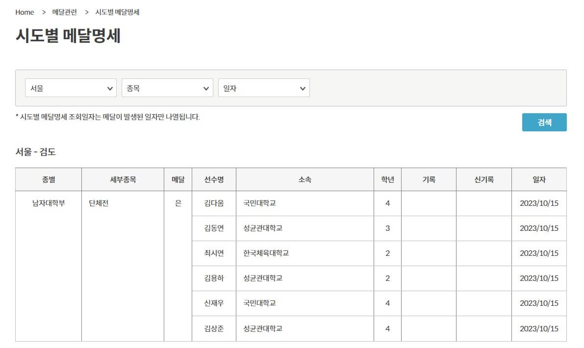검도의 경우를 예로 들면 검도종목의 전체 메달집계 현황을 검색해 보겠습니다.